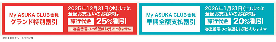 My ASUKA CLUB会員グランド特別割引:2025年12月31日(水)までに全額お支払いのお客様は旅行代金が25%割引(客室番号のご希望はお受けできません。ご予約時には「My ASUKA CLUB会員番号」を必ずお知らせください。)